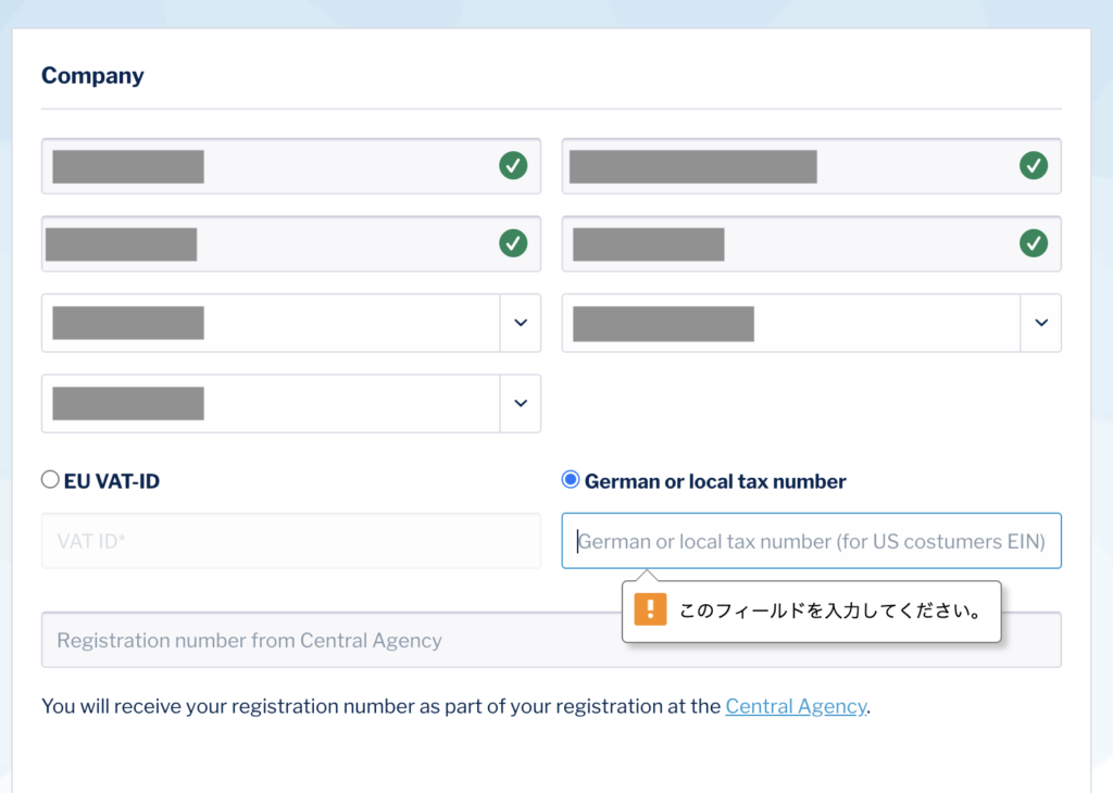 German or local tax number を選択したまま